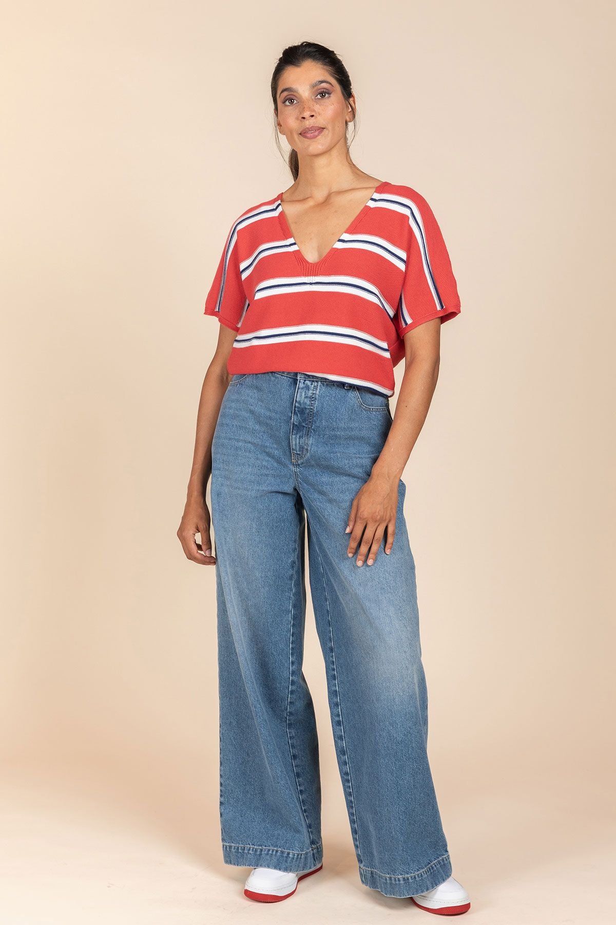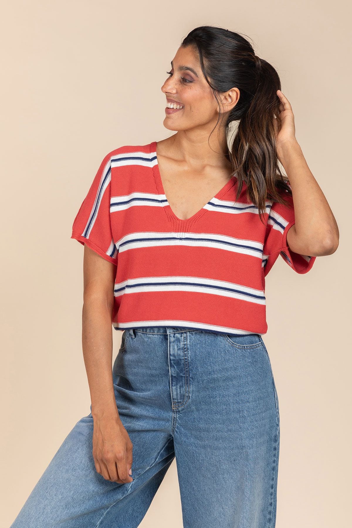 Hello there! Deze gebreide top met V-hals en licht oversized mouwen heeft een fijne afwerking en sprekende kleurencombinaties. Streepjes doen het altijd goed en zeker in deze heerlijke katoendraad die van hoge kwaliteit is. Perfect voor het tussenseizoen, en door het elegante ontwerp makkelijk te combineren voor zowel casual als nettere looks.