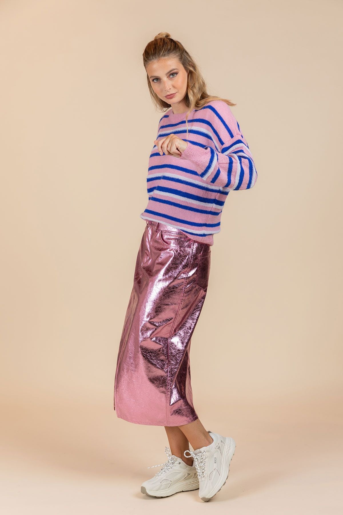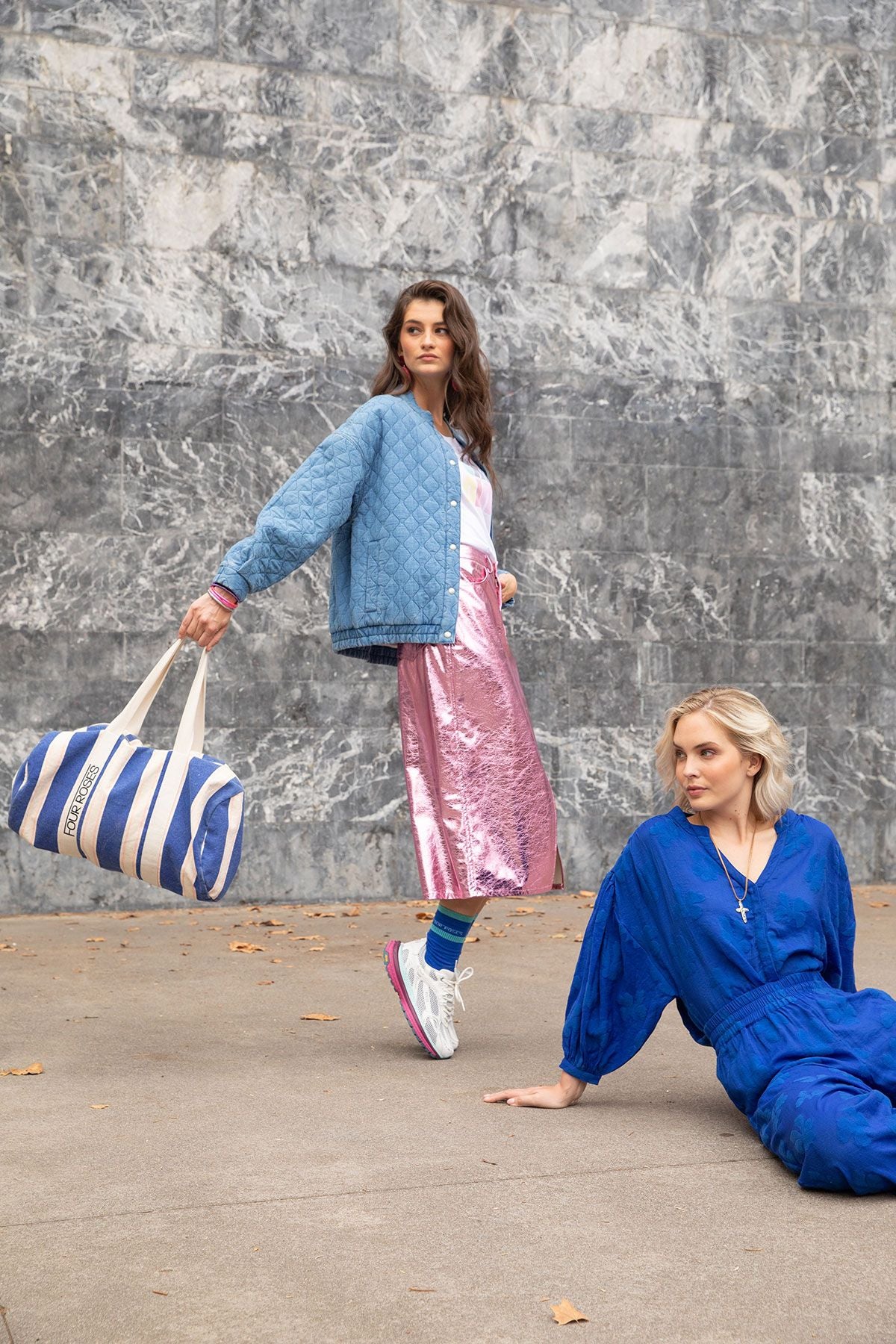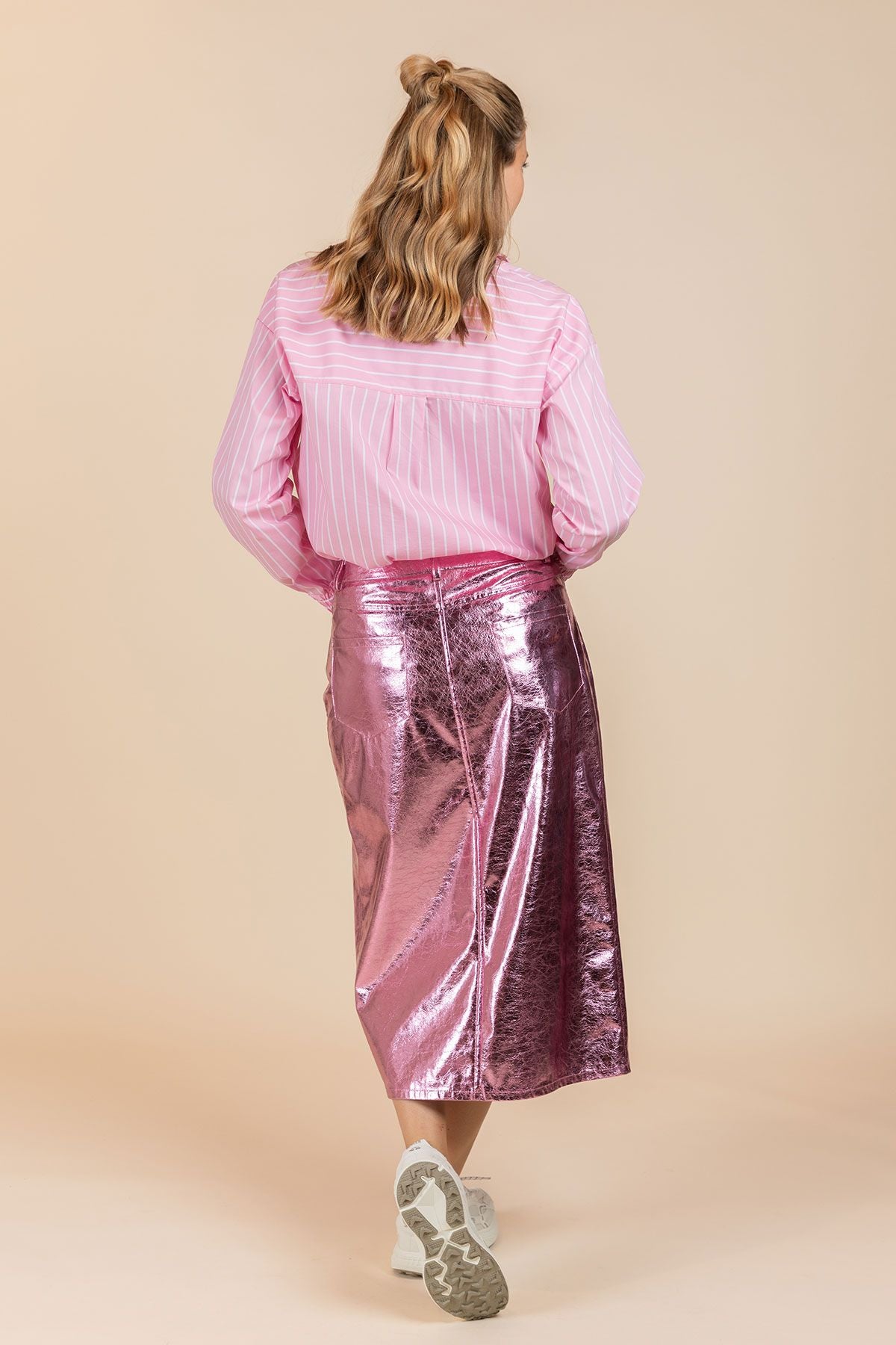 De eyecather van je garderobe. Dit model is een eigentijdse herinterpretatie van de bestseller denimrok.van Four Roses. De rok heeft het kenmerkende split vooraan, een inzetstuk achteraan voor de perfecte pasvorm en handige zakken voor extra functionaliteit. De metallic roze afwerking voegt een gedurfde, moderne flair toe, waardoor het geheel een verbluffende combinatie vormt van tijdloze elementen en een gedurfde, opvallende twist.