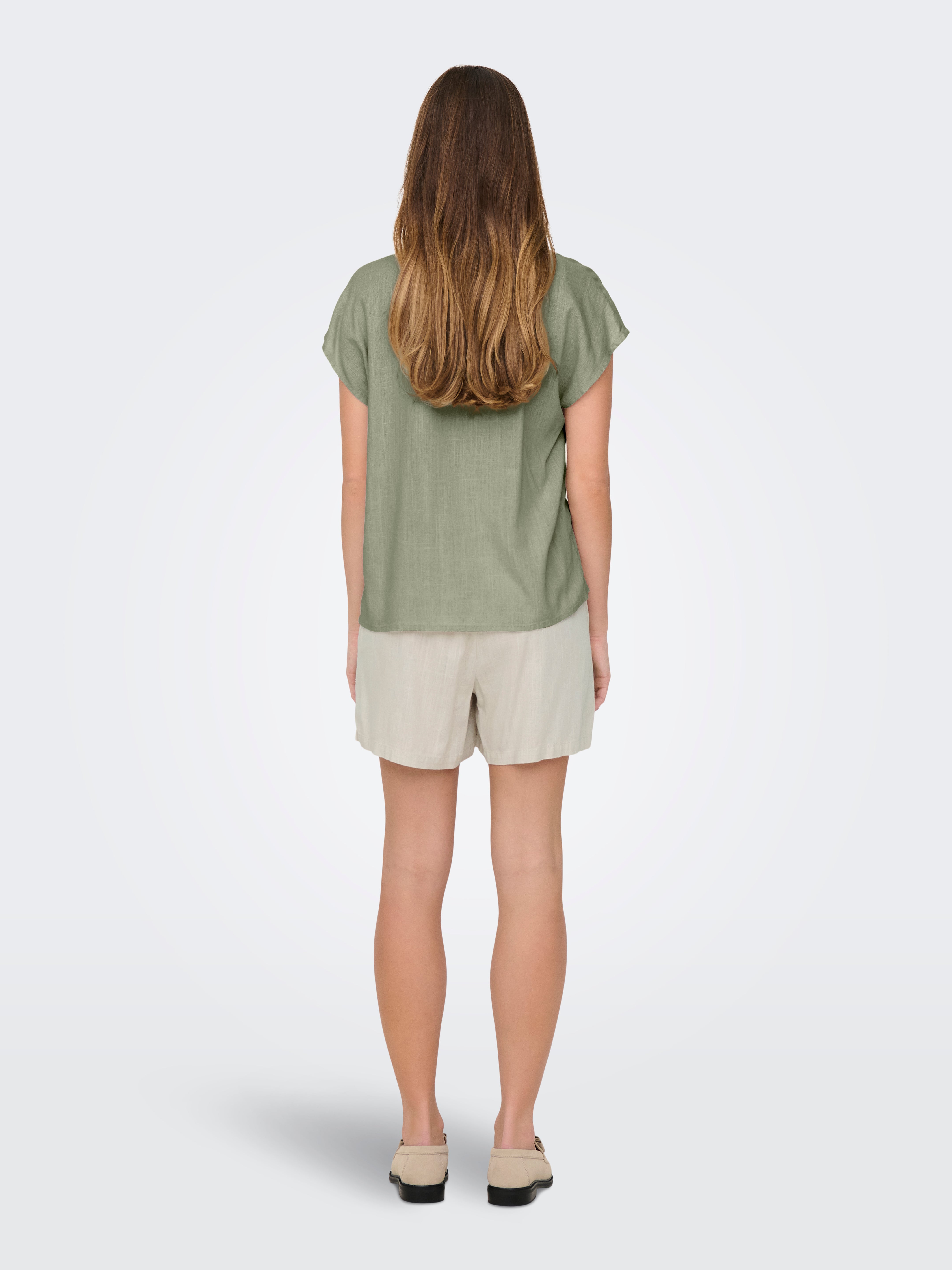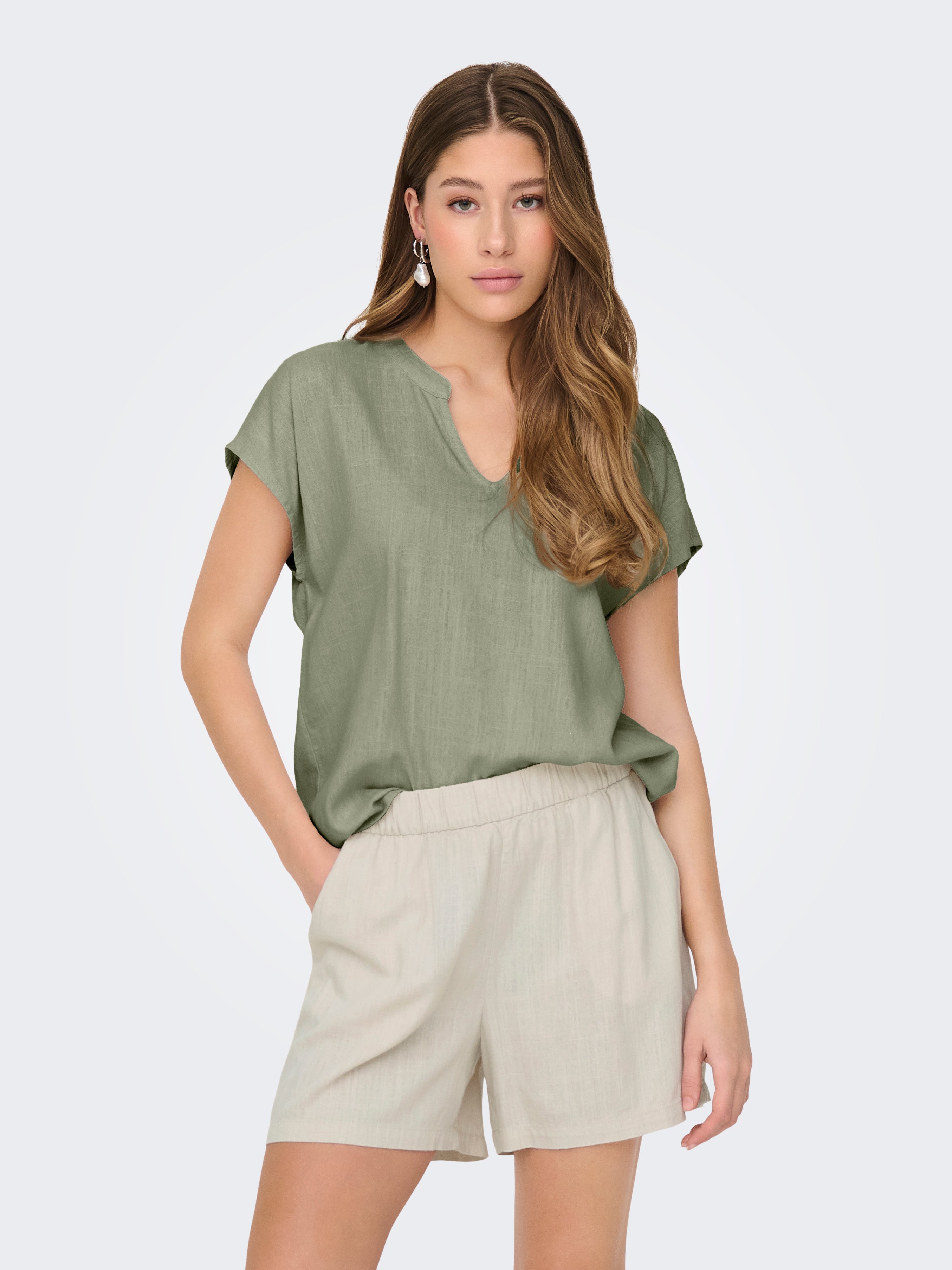 Zomerste top met V-hals en korte mouwen. Deze Caya top is heerlijk luchtig in de zomer dankzij de viscoselinnen kwaliteit.
