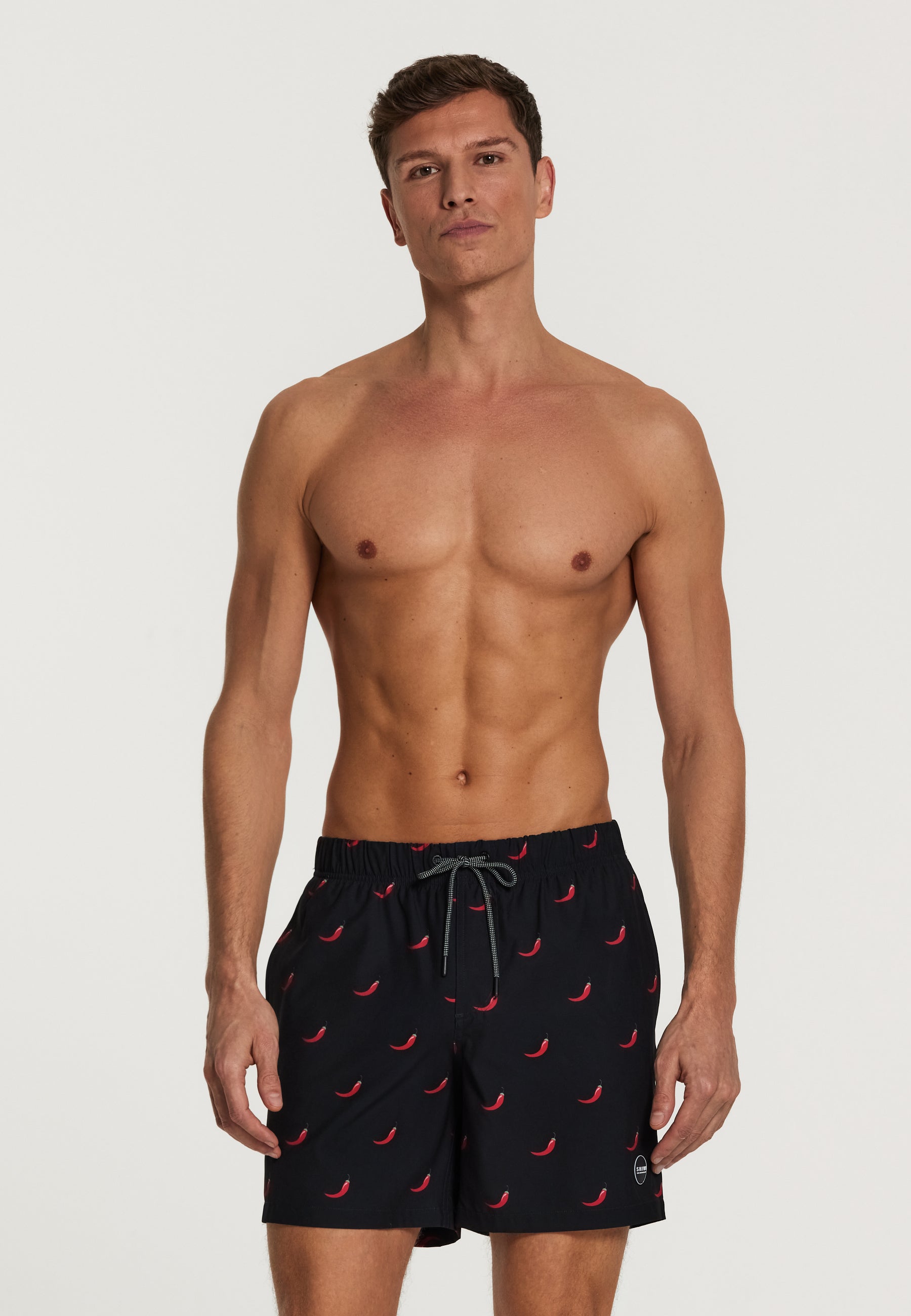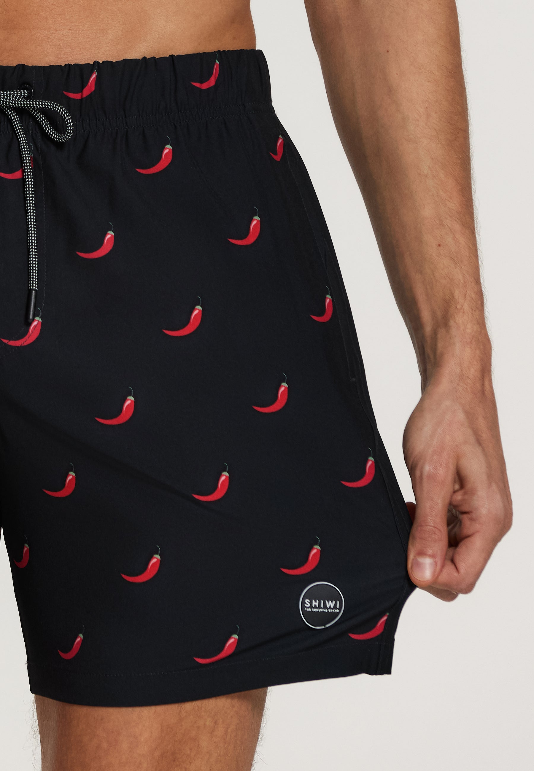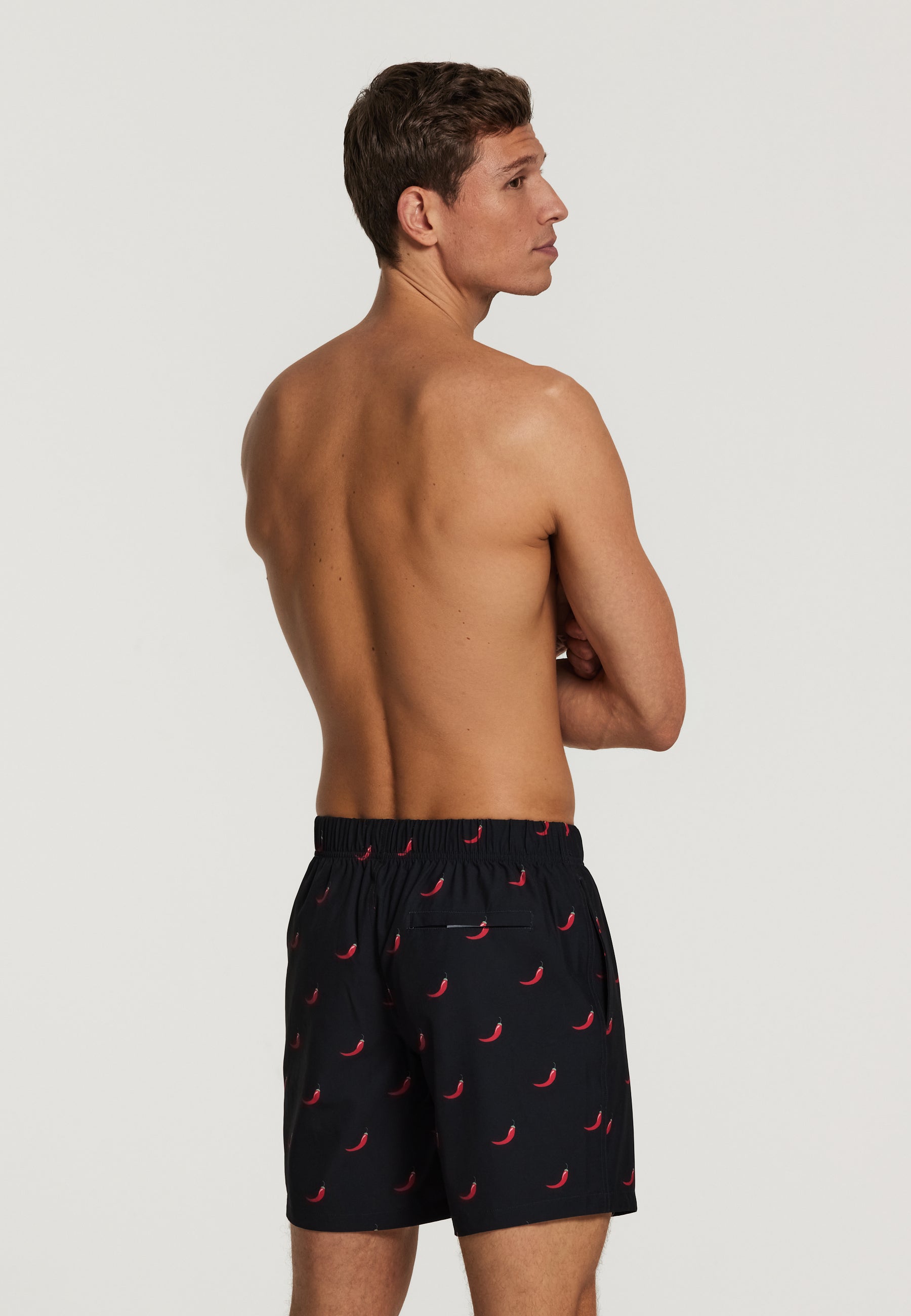 Zwarte zwemshort met extra stretch en een print van rode chilipepers.