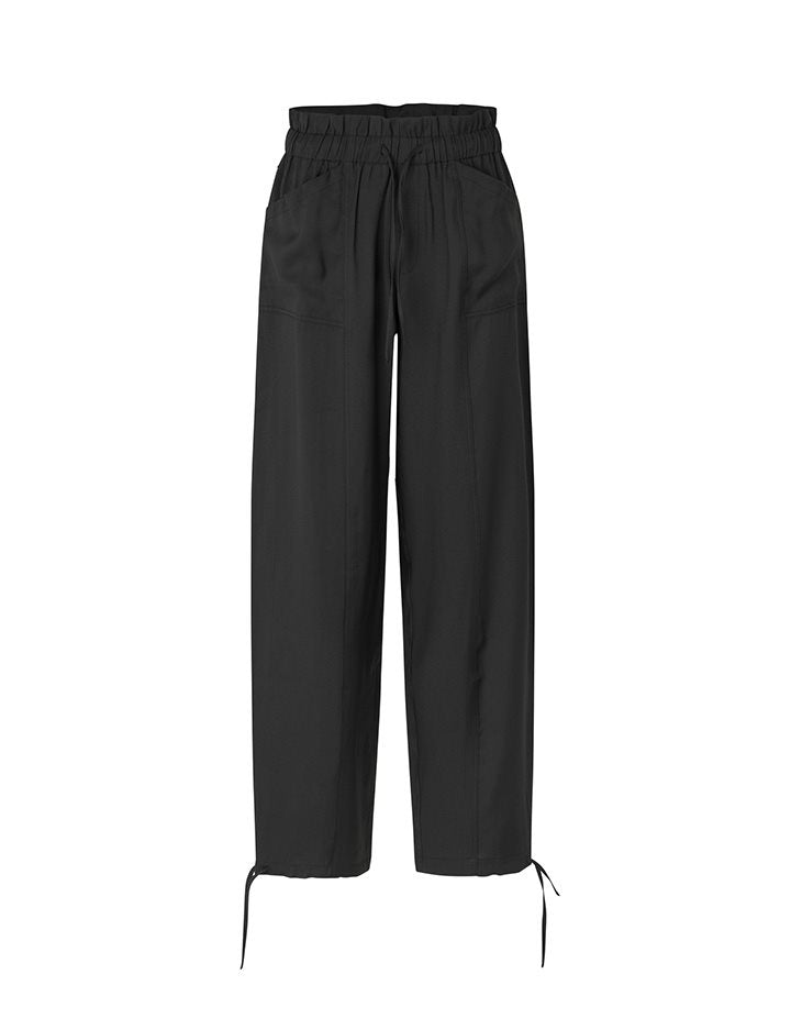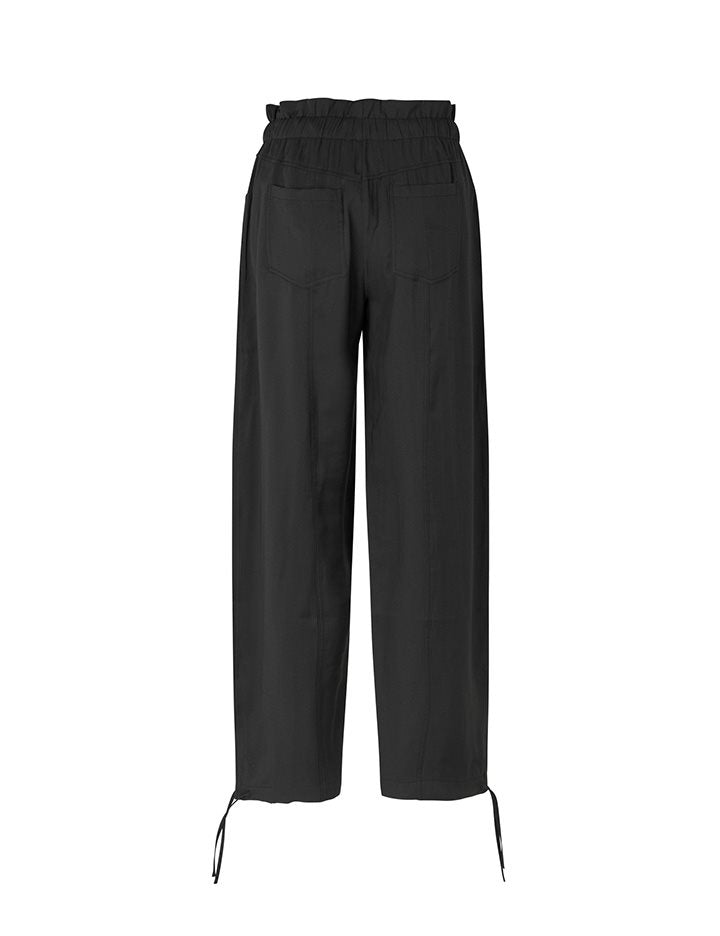 De Darelia broek is een prachtige, zwarte broek met hoge taille en paperback afwerking. De stof valt vlot langs het been en de tailleband heeft een ingewerkte elastiek met trekkoord. Verder steekzakken en achterzakken met paspel. Geweven broek met stiksels.