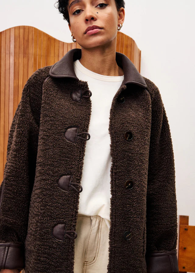 De Honeybush winterjas kan een echt statement piece in je kleerkast zijn. Het grote voordeel is dat hij omkeerbaar is. De ene dag kan je gaan voor de stoere, bruine, neplederen look. De andere dag verkies je misschien de zachte, teddy buitenkant. Hij heeft een afgerond hemdskraagje en ook de knoopsluiting is aan beide kanten verschillend wat je kan zien op de modelfoto's. Jouw favoriete winterjas van het seizoen?!