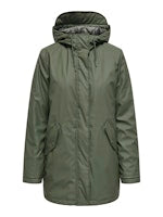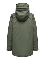 Tijmgroene gewatteerde regenjas met capuchon met trekkoord. Deze Izzy jas heeft steekzakken vooraan met een klep en drukknop. Verder een rits die ook nog eens afgeschermd is met een regenbestendige stof en drukknopen.