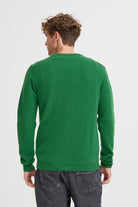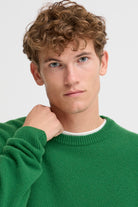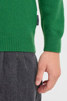 Groene lamswollen trui met ronde hals. Liever een rolkraag? Dat kan, maar dan in ecru!