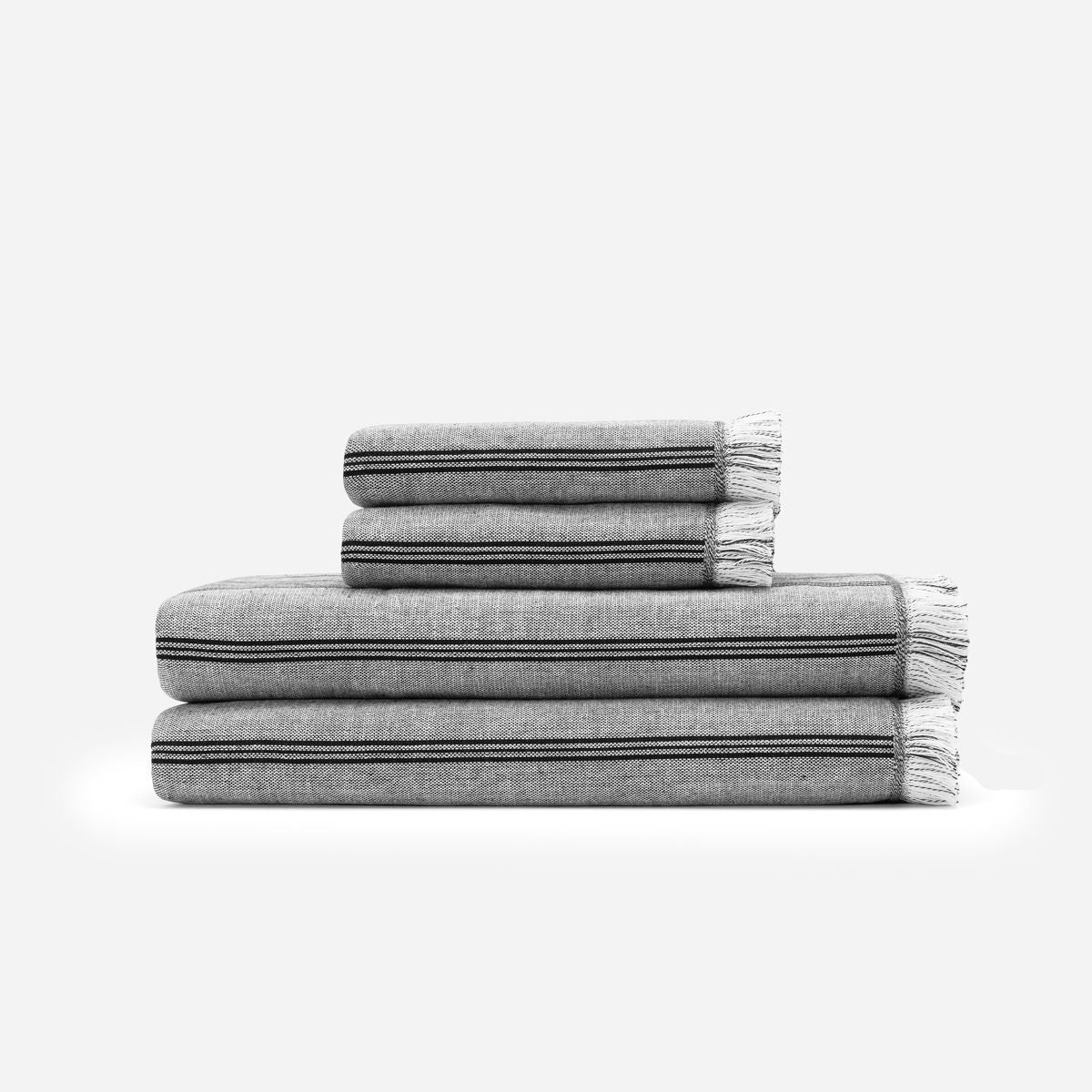 Gestreepte handdoek met aan de ene kant de Turkse stof en aan de andere kant de badstof. We hebben er ook een leuk kleiner formaat als handdoekje.