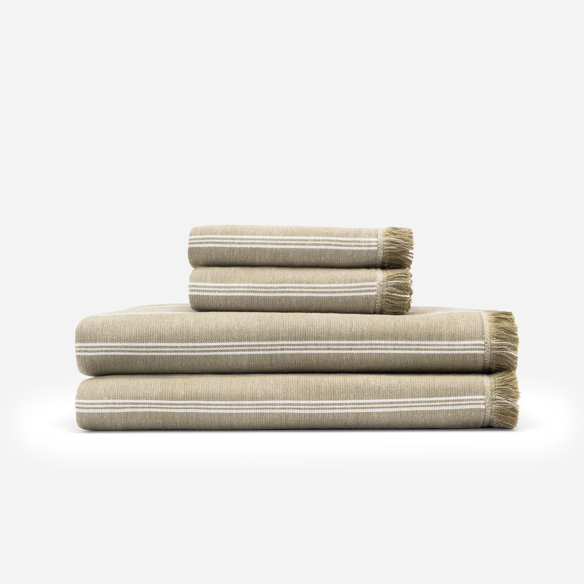 Gestreepte kleine handdoek met aan de ene kant de Turkse stof en aan de andere kant de badstof. We hebben er ook een leuk groot formaat als badhanddoek.