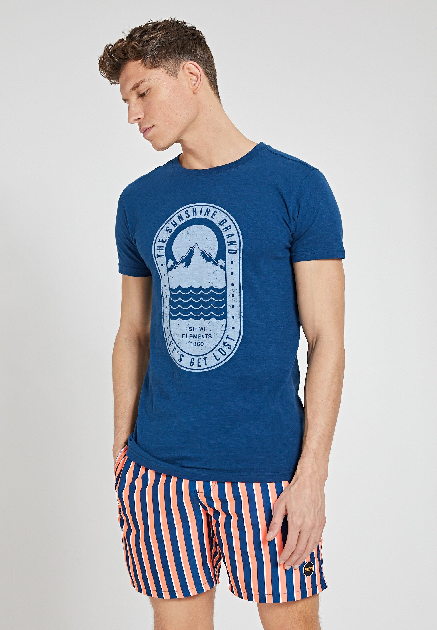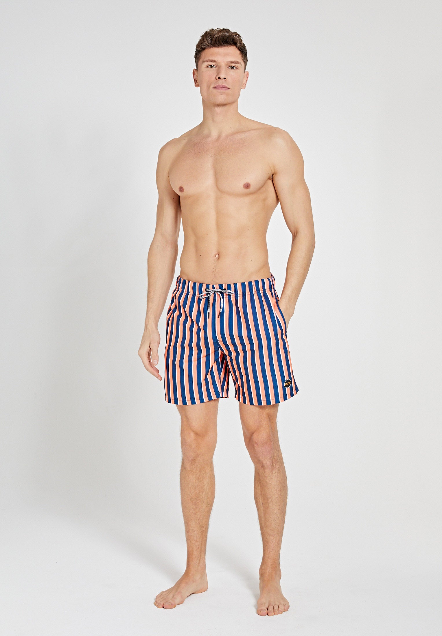 Gestreepte zwemshort in blauw, wit en oranje. Binnenin heb je een onderbroekje en aan de buitenzijde 2 steekzakken en een achterzak. De elastische tailleband heeft ook een verstelbaar trekkoord zodat je hem prima kan aantrekken mocht dat nodig zijn.