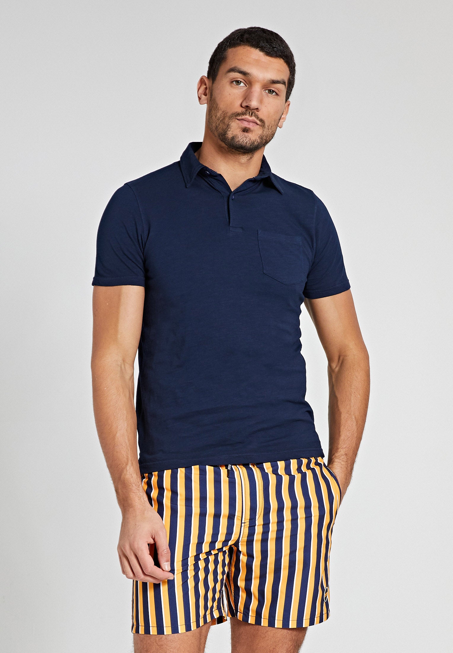 Gestreepte zwemshort in geel, blauw en wit. Binnenin heb je een onderbroekje en aan de buitenzijde 2 steekzakken en een achterzak. De elastische tailleband heeft ook een verstelbaar trekkoord zodat je hem prima kan aantrekken mocht dat nodig zijn. Je kan deze short perfect combineren met de Bart polo.