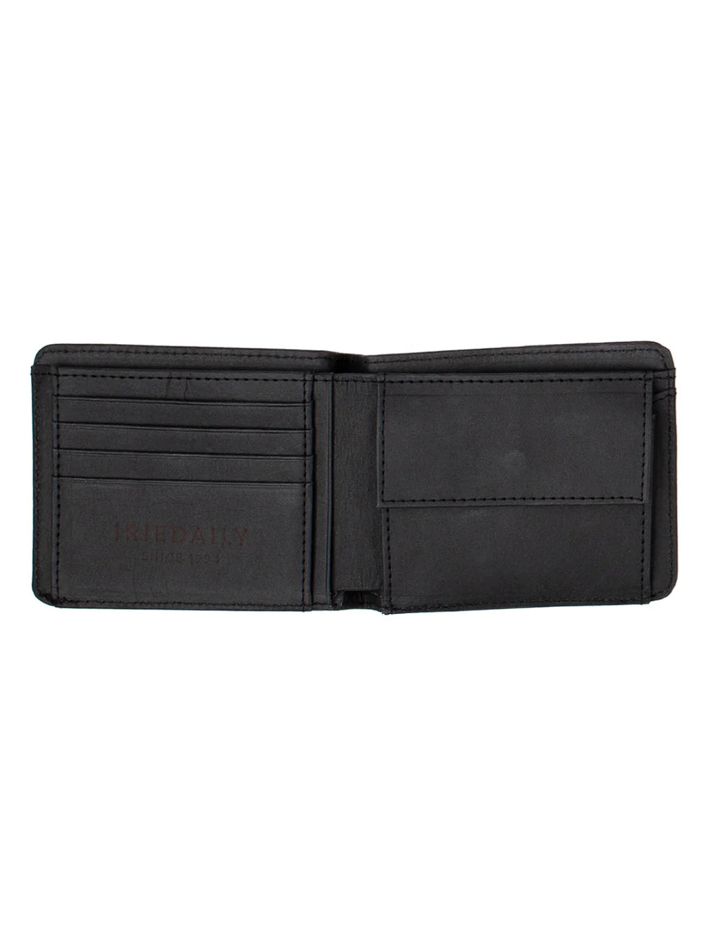 portefeuille, gemaakt van wasbaar paoier en een logoprint in reliëf aan de buitenkant. 2 grote vakken voor briefjes, diverse insteekvakken en muntvakje met drukknop.