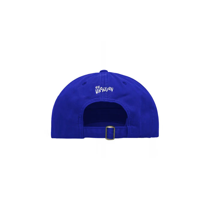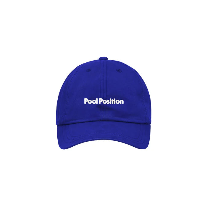 Blauwe pet met logo embroidery aan de achterkant en 'pool position' aan de voorkant. Je kan ze op maat aanpassen met het lint achteraan.