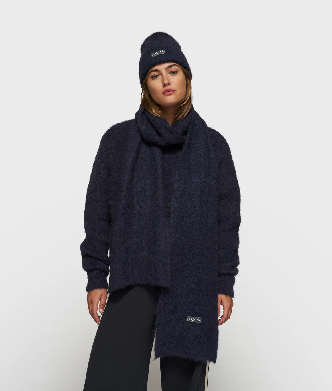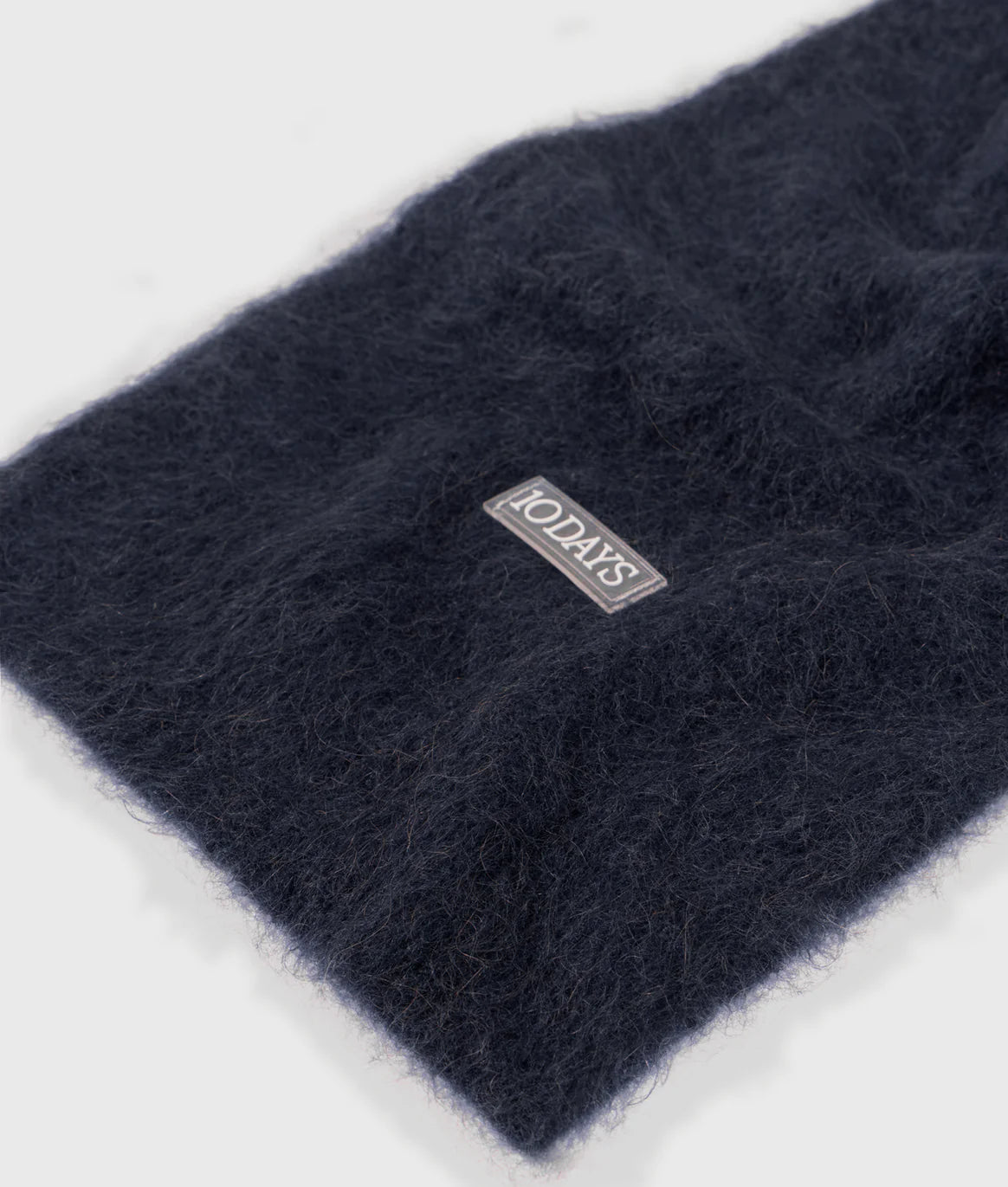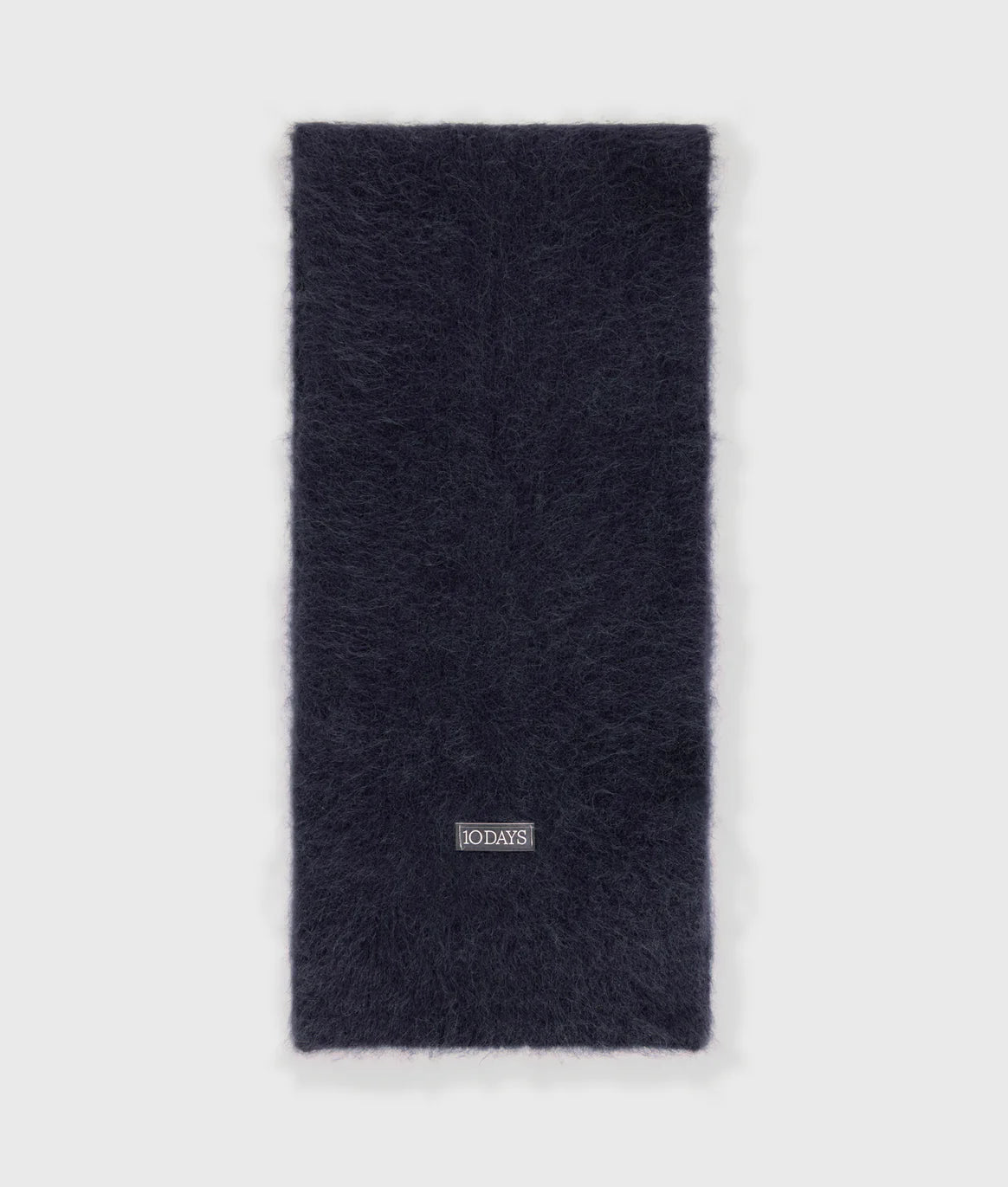 Rechthoekige gebreide sjaal, gemaakt van zachte brushed hairy wolblend. Voorzien van een 10DAYS label langs de zoom en een transparant label op de sjaal. Afmeting: 25 x 200 cm.